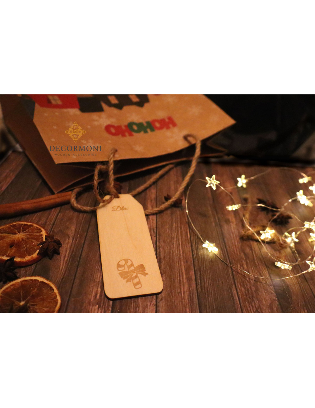 Etykieta na prezent posiada wygrawerowany napis : "Dla" i grafiką świąteczną. Zawieszka do samodzielnego wypisania np. długopisem, kredką czy mazakiem - którego nie ma w zestawie z etykietką. Nie ma możliwości graweru np. imienia na zawieszce świątecznej.